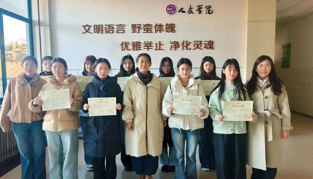 2025年12月22日,淄博师专教师语言课程组为获奖学子们颁发荣誉证书,同学们手持荣誉证书合影留念,人文学院墙面上“文明语言 野蛮体魄,优雅举止 净化灵魂”的标语格外醒目,这不仅是对参赛选手的精神寄语,也彰显了学校对学生综合素质培养的重视。此次经典诵读大赛,既为同学们提供了展示自我的舞台,也让大家在经典文韵的浸润中提升了语言表达与文化感悟能力。
